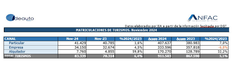 Las ventas de turismos registran un crecimiento del 6,4% en noviembre, con 83.339 nuevas matriculaciones. El mercado sigue aumentando, encadenando un trimestre al alza impulsado este último mes por un incremento en todos los canales, en particular en los alquiladores, y por las ventas en auge de los híbridos convencionales. Hasta noviembre, el mercado acumula 911.503 ventas, que supone un aumento del 5,1% y que si se mantiene este ritmo en diciembre es posible que este año cierre en torno al millón de unidades.