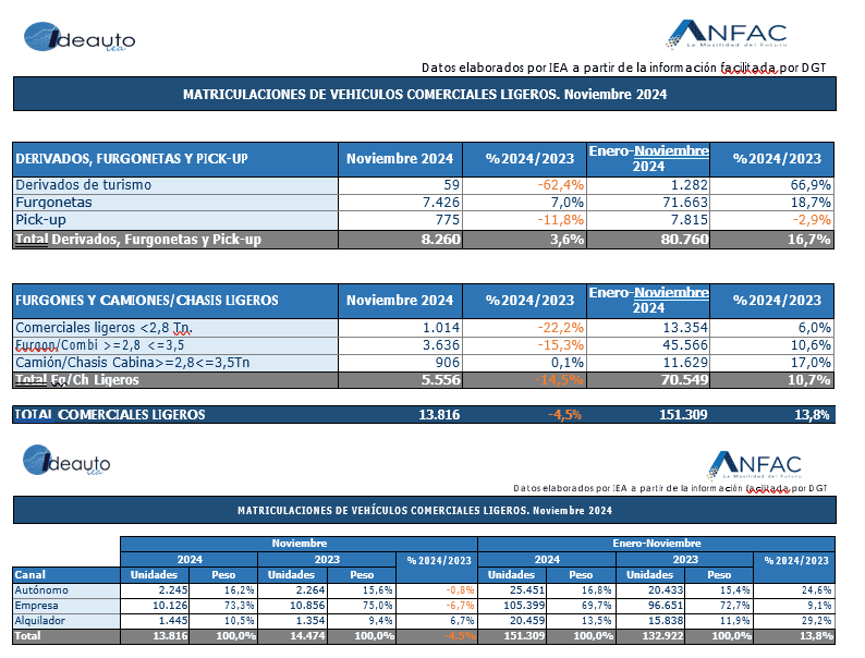 Las matriculaciones de vehículos comerciales ligeros descienden un 4,5% en noviembre, con 13.816 unidades. Hasta el penúltimo mes, se acumulan 151.309 unidades en total, con un aumento anual del 13,8%. Por canales, tanto autónomos como empresas registran caídas del 0,8% y del 6,7%, respectivamente. Solamente, las ventas dirigidas a alquiladores logran una mejora, con un aumento del 6,7% en noviembre.