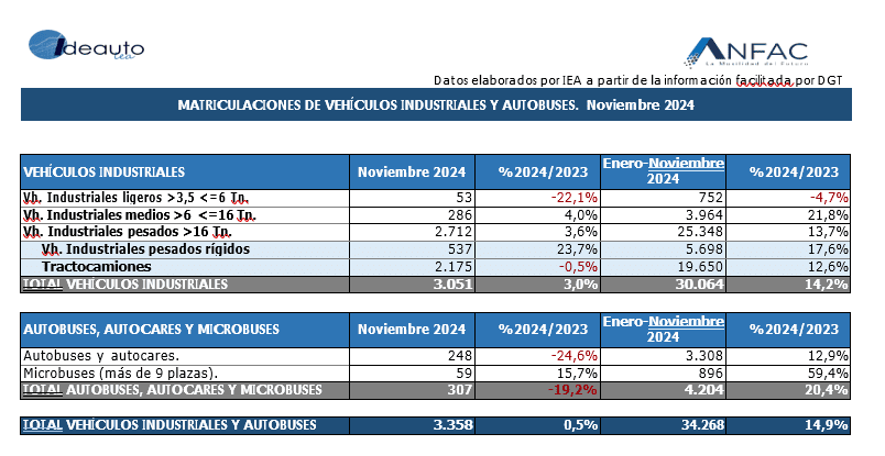En noviembre, las matriculaciones de vehículos industriales, autobuses, autocares y microbuses mantienen el ritmo positivo y registran un crecimiento del 0,5%, con 3.358 unidades. En el total del año, se acumulan 34.268 unidades, que supone un crecimiento del 14,9%. Por tipo de vehículos, los industriales obtienen 3.051 nuevas matriculaciones, un 3% más que el año anterior. Por su parte, las ventas de autobuses y autocares descienden un 19,2%, con 307 unidades registradas en noviembre.